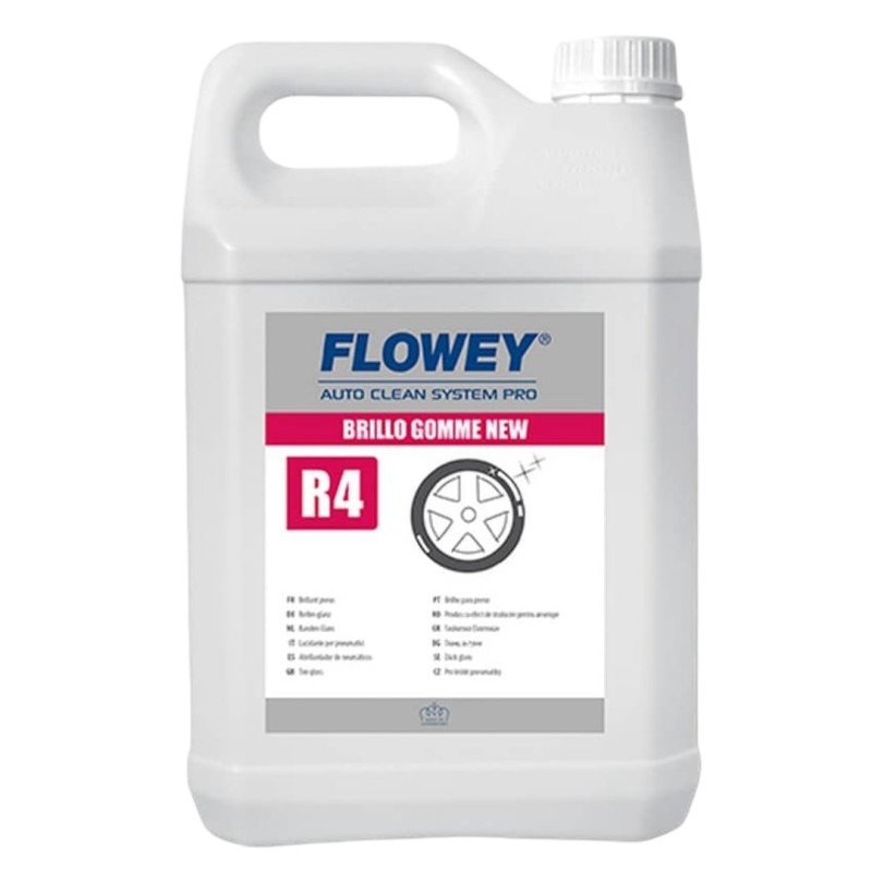 FLOWEY R4 BRILLO GOMME on rehviläige, mis taastab rehvi külgede musta, satiinse ja ühtlase välimuse. Taimsel toorainel põhinev koostis toidab kummi, annab sügava läike, levib ühtlaselt kogu rehvipinnale ning püsib hästi ka vertikaalsetel pindadel. Toode ei pragune ega jäta rante ning sobib kasutamiseks autopesulates, töökodades ja sõidukiparkide hoolduses. Kasutamiseks kantakse toode käsna abil rehvi külgedele ning lastakse kuivada.