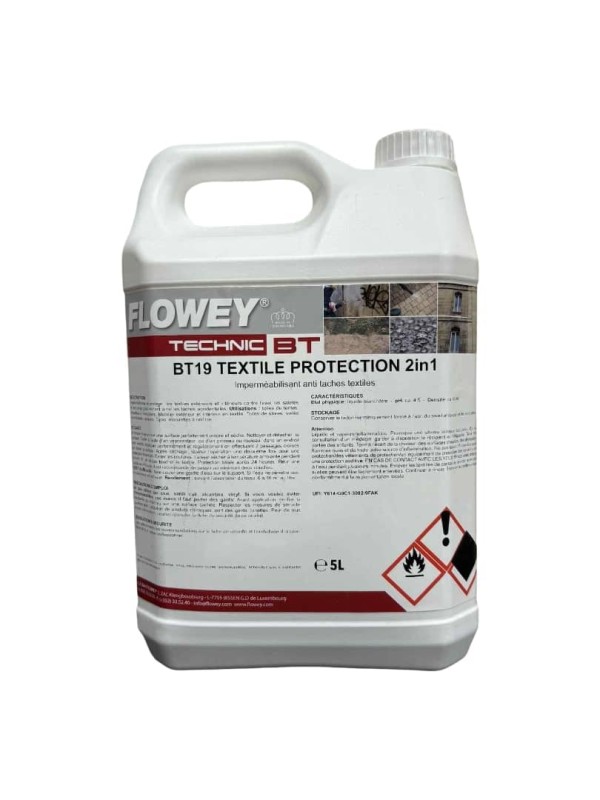 FLOWEY BT19 Textile Protection 2 in 1 on professionaalne tekstiilide immutus- ja plekikaitsevahend, mis kaitseb kangaid vee, mustuse ja rasvaplekkide eest nii sise- kui ka välistingimustes. Toode tungib sügavale tekstiilikiududesse ja moodustab nähtamatu kaitsekihi, mis takistab vedelike ja mustuse imendumist kangasse. BT19 muudab tekstiilid vett ja õli hülgavaks, võimaldades juhuslikud plekid (nt kohv, tee, karastusjoogid, šokolaad, veri, puuviljad või ketšup) lihtsalt maha pühkida enne, kui need kangasse imbuvad. Kaitse ei muuda kanga välimust, värvi ega tekstuuri ning säilitab materjali hingavuse ja elastsuse. Toode on veepõhine, lõhnatu pärast kuivamist ning sobib ideaalselt telkidele, markiisidele, varikatustele, aiakatetele, tekstiilmööblile, vaipadele ja lühikese karvaga vaipkatetele. Kaitseefekt on täielik umbes 24 tunni möödudes ning regulaarne kasutamine lihtsustab oluliselt tekstiilide hooldust ja puhastamist.
