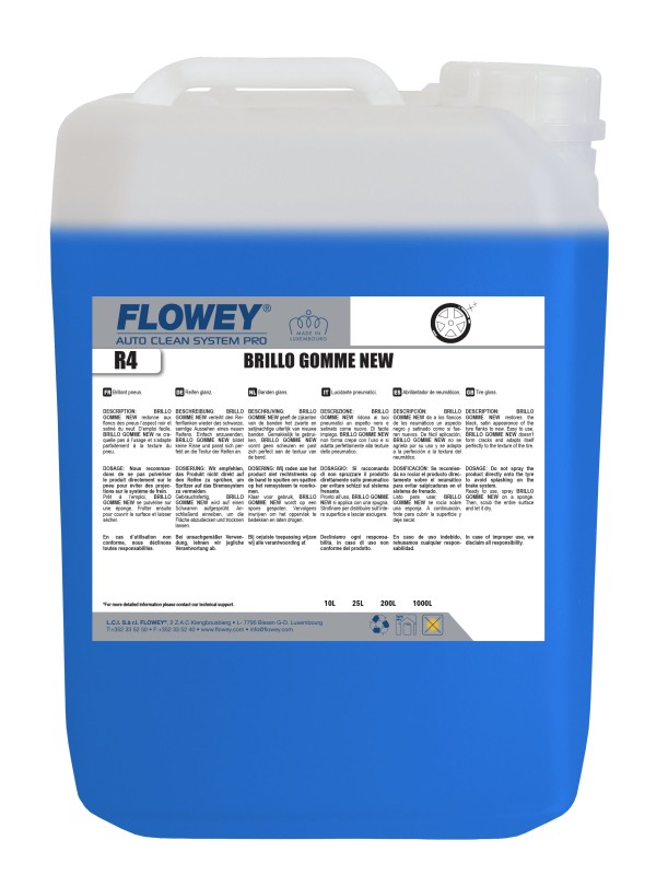 FLOWEY R4 BRILLO GOMME on rehviläige, mis taastab rehvi külgede musta, satiinse ja ühtlase välimuse. Taimsel toorainel põhinev koostis toidab kummi, annab sügava läike, levib ühtlaselt kogu rehvipinnale ning püsib hästi ka vertikaalsetel pindadel. Toode ei pragune ega jäta rante ning sobib kasutamiseks autopesulates, töökodades ja sõidukiparkide hoolduses. Kasutamiseks kantakse toode käsna abil rehvi külgedele ning lastakse kuivada.