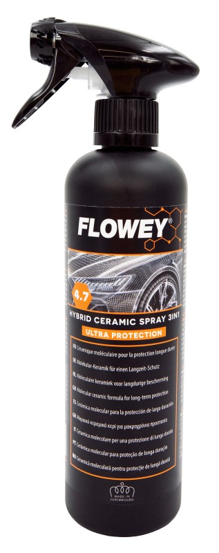 FLOWEY 4.7 HYBRID CERAMIC SPRAY 3IN1 on keraamilisel tehnoloogial põhinev kaitsesprei, mis annab pinnale sügava läike ja tugeva vetthülgava kaitsekihi. Toode loob pikaajalise kaitse, mis vähendab mustuse kinnitumist ja parandab vee ärajuhtimist. Sobib kasutamiseks kõigil sõidukipindadel, sh kerepaneelid, veljed ja kabrioleti tekstiil- või vinüülkatused. Väga lihtne kasutada nii kuival kui märjal pinnal ning jätab pinnad siledaks, läikivaks ja hästi kaitstuks.