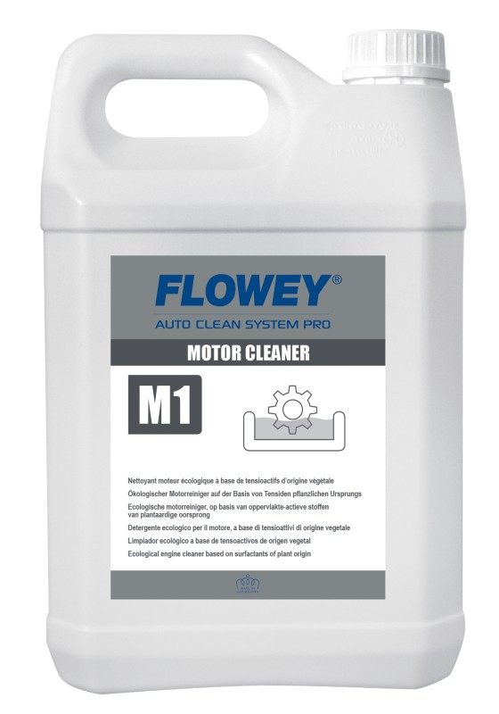 FLOWEY M1 MOTOR CLEANER on ökoloogiline ja väga tõhus mootoripuhastusvahend, mis eemaldab kiiresti õli, rasva, tahma ja muu mustuse mootorilt ja mootoriruumist. Taimsel toorainel põhinev kontsentraat ei sisalda fosfaate, NTA-d ega kloori ning on ohutu alumiiniumile, plastdetailidele ja elektriühendustele. Toode vastab VDA standardile ning on mõeldud professionaalseks kasutamiseks autopesulates, töökodades ja sõidukiparkides. Kasutamiseks lahjendada 20%, kanda harja või pihustiga, lasta mõjuda paar minutit ning loputada puhta veega.