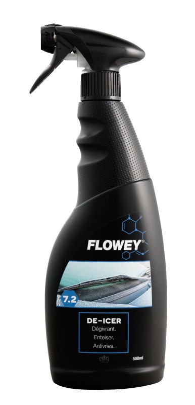 FLOWEY 7.2 DE-ICER on tõhus jääsulataja, mis eemaldab kiiresti akendelt ja keredetailidelt nii jää kui härmatise. Sobib kasutamiseks nii sõiduki välis- kui ka siseklaasidel ning aitab sulatada ka ukselukke. Toode toimib väga madalatel temperatuuridel kuni –30 °C, ei kahjusta tihendeid ega kojamehi ning aeglustab uue jää tekke. Lihtne kasutada – pihusta pinnale ja pühi puhtaks kojameestega või tõmba üle klaasilihvjaga.