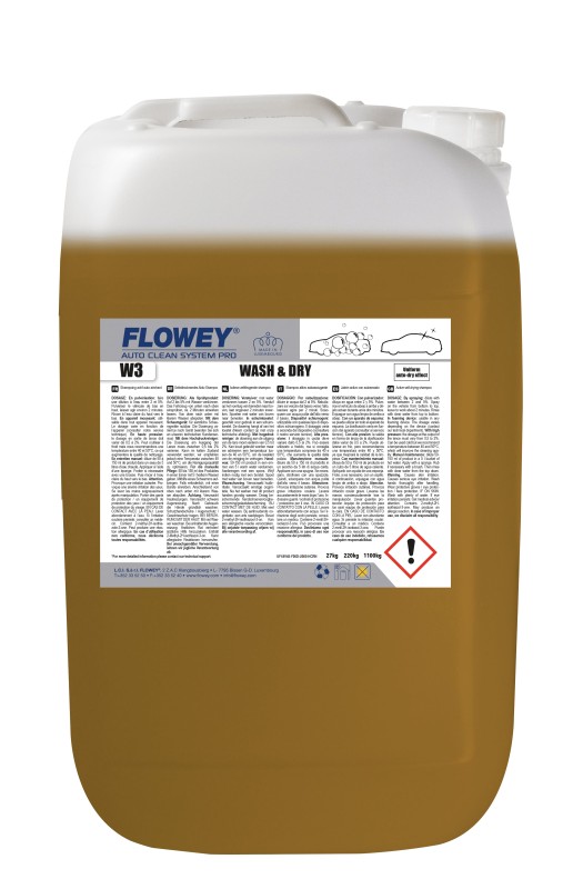 FLOWEY W3 WASH & DRY on tugevalt aluselise koostisega isekuivav autošampoon, mis ühendab pesu- ja kuivatusfunktsiooni. Pärast loputamist tõmbub vesi pinnalt ühtlaselt ära, tagades kiire ja plekivaba kuivamise ning jätab kerele läikiva viimistluse. Toode omab väga head puhastus- ja tungimisvõimet, sobib kasutamiseks ka kareda veega ning toimib kõikidel välispindadel: klaas, plast, roostevaba teras, värvipinnad. Kasutamiseks lahjendada soovituslikus vahemikus, kanda pinnale käsna, harja, pihusti, vahupüstoli või kõrgsurvepesuri abil, lasta mõjuda ning loputada. Mitte lasta pinnale kuivada enne loputamist.