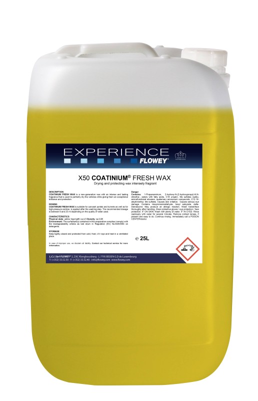 FLOWEY X50 COATINIUM® FRESH WAX on uus põlvkond väga intensiivselt lõhnav kuivatamisvaha, mis annab sõidukile erakordse läike ja tugeva kaitsekihi. Vaha taastab värvi sügavuse, värskendab plastpindu ja tekstiilkatusi ning loob vetthülgava pinnakaitse, mis kiirendab kuivamist ja parandab nähtavust vihmasõidul. Tootel on kõrge hüdrofoobsus, see maskeerib mikro-kriimustusi, jätab kere siidiselt sileda ning levitab pesulas värske lille- ja puuvilja aroomi. Sobib portaalidele, tunnelitele ja kõrgsurvepesuritele.