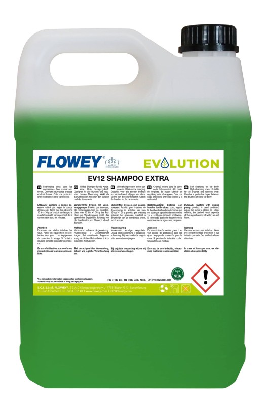 FLOWEY EV12 SHAMPOO EXTRA on ökoloogiline šampoon tunnel- ja portaalpesuritele, mis on valmistatud taimset päritolu pindaktiivsetest ainetest (nisu ja peet). Toode annab rikkaliku ja kreemja vahu, aitab vältida raua- ja lubjasette teket ning ei sisalda fosfaate ega NTA-d. Sobib kasutamiseks kõikides veetaaskasutusega pesulates ja ei ummista doseerimispumpasid. Lõhnakompositsioon on allergeenivaba. Kasutamiseks doseeritakse lahjendamata kujul, saavutades 15–30 g sõiduki kohta, sõltuvalt vee, õhu ja vahu segamisest.